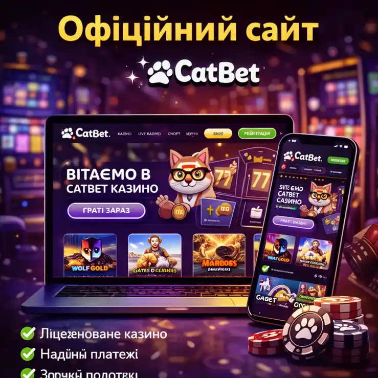 Офіційний сайт CatBet працює під ліцензією PlayCity з 24 березня 2026 року. Платформа пропонує понад 5000-7000 ігор в каталозі, підтримує гривневі платежі без конвертації та надає повну українізацію інтерфейсу. Оператор - ТОВ «4ФАН», а термін дії ліцензії становить 5 років.